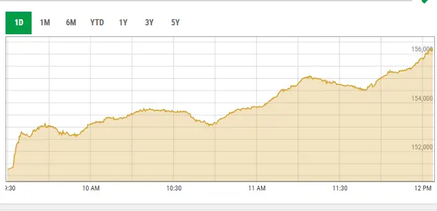 Indeks KSE-100 wzrósł o 7 461,58 pkt, czyli 5,02 proc., do poziomu 156 204,89 z poprzedniego zamknięcia na poziomie 148 743,31.