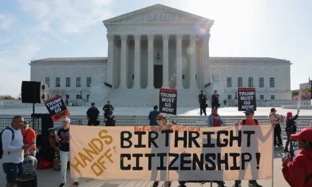 Demonstranci trzymają transparenty przed budynkiem Sądu Najwyższego Stanów Zjednoczonych w dniu, w którym sąd ma wysłuchać ustnych wystąpień na temat legalności wysiłków administracji Trumpa na rzecz ograniczenia pierworództwa obywatelskiego dla dzieci imigrantów, Waszyngton, DC, USA, 1 kwietnia 2026 r. — Reuters